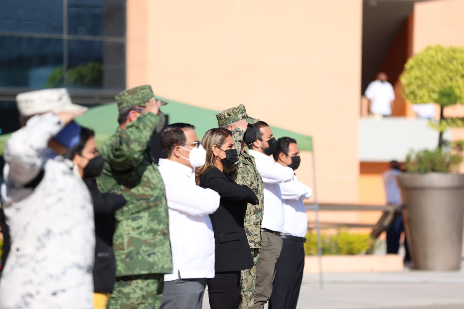 Chilpancingo, Gro., 10 de enero de 2022.- La gobernadora Evelyn Salgado Pineda encabezó la primera ceremonia del año del Homenaje e Izamiento de Bandera correspondiente al mes de enero, en la sede del Poder Ejecutivo, privilegiando en todo momento las medidas sanitarias preventivas, ponderando la salud de las y los trabajadores del estado.