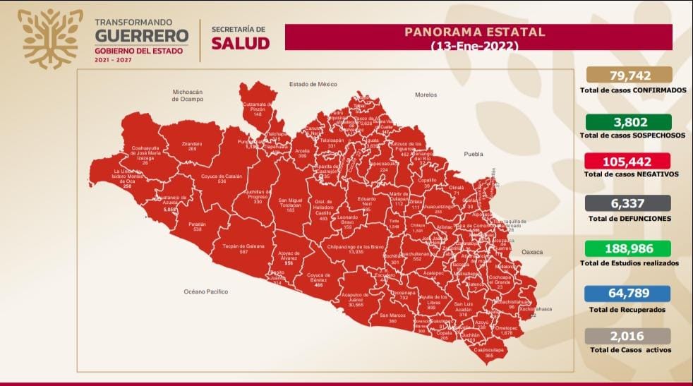 Los 2,016 casos activos se concentran principalmente en los siguientes municipios: Acapulco de Juárez, 777; Chilpancingo de los Bravo, 325; Iguala de la Independencia, 243; Zihuatanejo de Azueta, 162; Taxco de Alarcón, 130; Pungarabato, 77; Chilapa de Álvarez, 38; Ometepec, 32; Coyuca de Catalán, 24; y Huitzuco de los Figueroa, 20.
