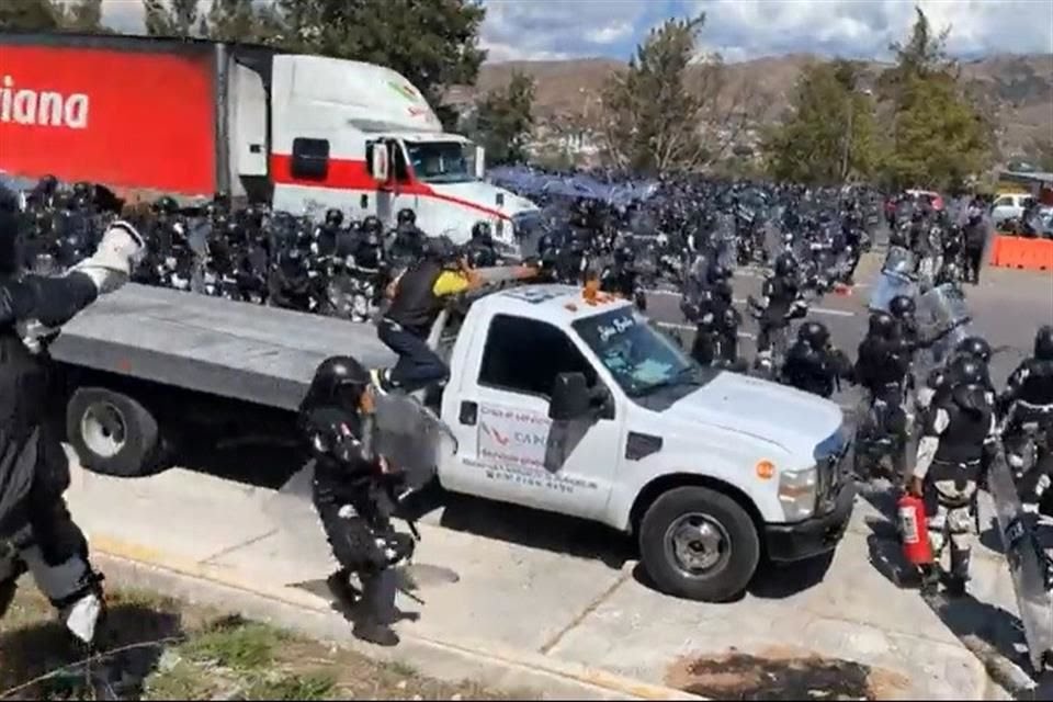 Esta acción permitió liberar la caseta de peaje y los inconformes se alejaron del punto, momento en el que emplearon un tráiler sin conductor y lo lanzaron contra la línea de efectivos de la Guardia Nacional, quienes esquivaron la unidad de carga que se impactó contra una instalación metros adelante de la caseta de cobro.