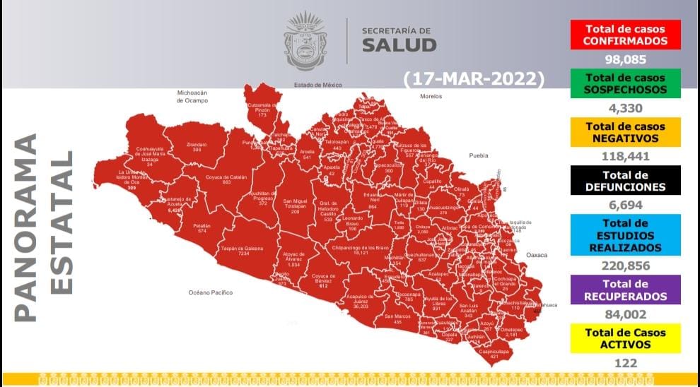 Desde el inicio de la pandemia, en Guerrero se acumulan 98,085 casos confirmados y 6,694 defunciones, y que los 122 casos activos se ubican en los municipios de Chilpancingo con 46; Acapulco, 25; Iguala, 22; Zihuatanejo, 4; Chilapa, Ometepec y Taxco con 3, y Atoyac, Gral. Heliodoro Castillo y Tlacoachistlahuaca, con 2 cada uno, manteniendo una ocupación de camas Covid del 5 por ciento.