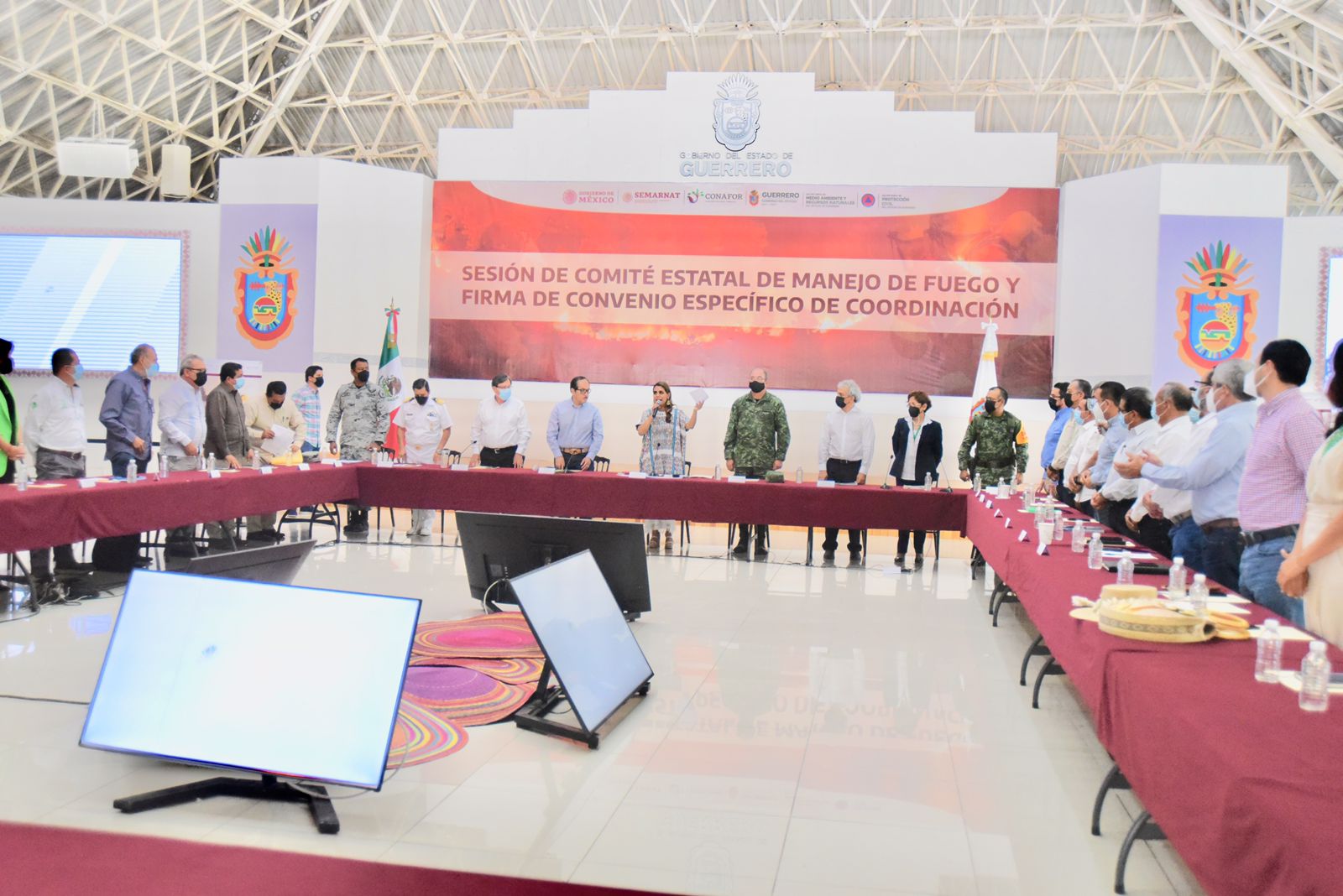 Chilpancingo, Gro., 18 de marzo del 2022.- La gobernadora Evelyn Salgado Pineda acompañada del titular de la Comisión Nacional Forestal (CONAFOR), Luis Meneses Murillo, encabezó la sesión del Comité Estatal de Manejo de Fuego y firmó un convenio específico de coordinación para reforzar las acciones de prevención y combate, para reducir y mitigar los incendios forestales con un estado de fuerza de 760 combatientes integrados en 74 brigadas de distintas instituciones en Guerrero.
