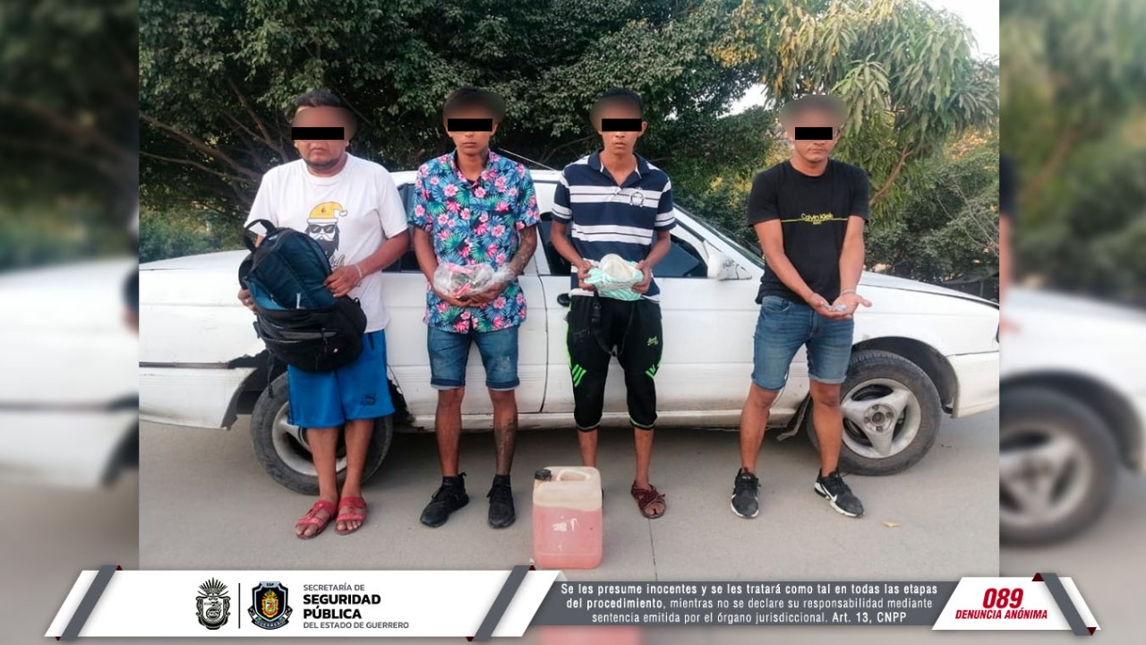 Chilpancingo, Guerrero, 25 de marzo de 2022.- En acciones de vigilancia y prevención del delito, personal de la Policía Estatal detuvieron a cuatro personas en posesión de presunta droga y cuatro litros de combustible en el municipio de Acapulco.