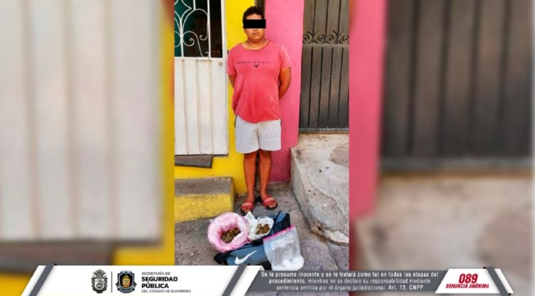 La persona fue identificada como Luis “N”, a quien se le localizaron dos bolsas de plástico transparentes con hierba verde, características de la marihuana, así como dos bolsas más con sustancias sólidas, similar a la droga conocida como “cristal”.