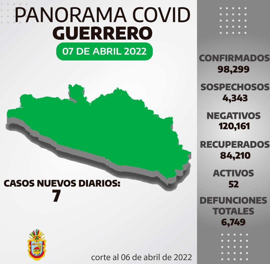 Chilpancingo, Gro., 07 de abril 2022.- La Secretaría de Salud dio a conocer el informe técnico “Covid-19 Guerrero” del día de hoy, donde indica que la entidad se ubica en el lugar 29 a nivel nacional en casos activos de Covid-19 con 52, confirmando 7 nuevos contagios y ninguna defunción en las últimas 24 horas, manteniendo una ocupación de camas Covid, del 3 por ciento.
