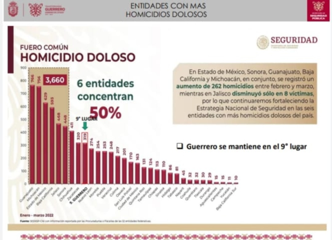 El reporte del Secretariado señala que, en enero, febrero y marzo pasado, seis estados concentran el 50 por ciento de los homicidios dolosos. Mientras que Guerrero se ubica en el lugar número nueve.