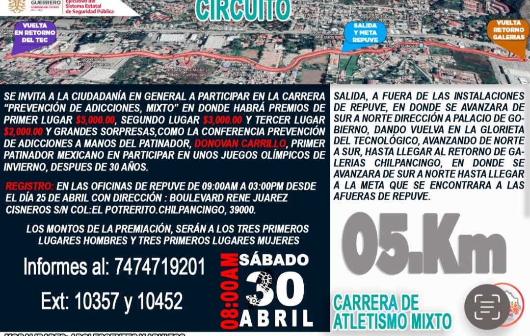 El evento y punto de partida de ambas carreras, será frente a las instalaciones del Registro Público Vehicular (REPUVE) ubicadas en boulevard René Juárez Cisneros; se premiará a los tres primeros lugares de hombres y mujeres que lleguen a la meta, con premios desde los dos a los cinco mil pesos.