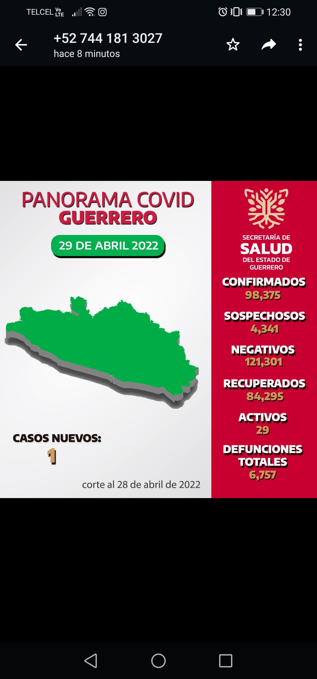 Chilpancingo, Gro., 29 de abril 2022.- La Secretaría de Salud estatal informó que a este día, el informe técnico “Covid-19 Guerrero”, destaca la presencia de 29 casos activos, además de un solo contagio y ninguna defunción por este virus en las últimas 24 horas, manteniendo el registro de un solo deceso en el presente mes.