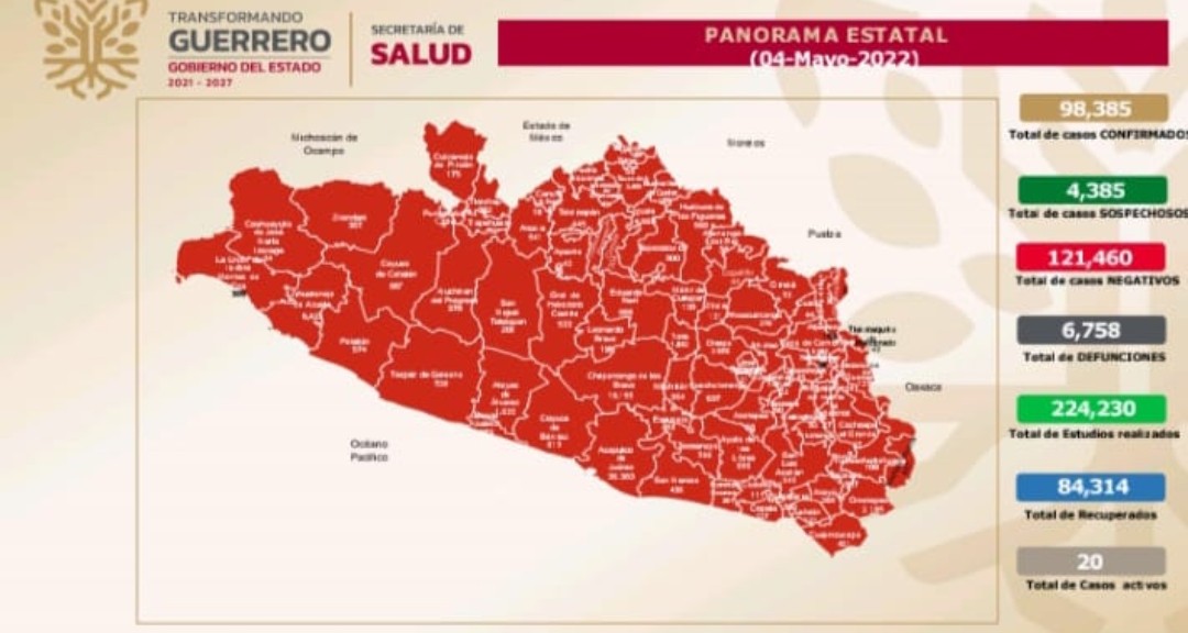 Al 03 de mayo, el Estado de Guerrero concentra 20 casos activos en ocho municipios: Acapulco, 10; Chilpancingo, 3; Taxco, 2; Chilapa, 1; Huitzuco, 1; Iguala, 1; Tlapehuala, 1; y Tixtla, 1.