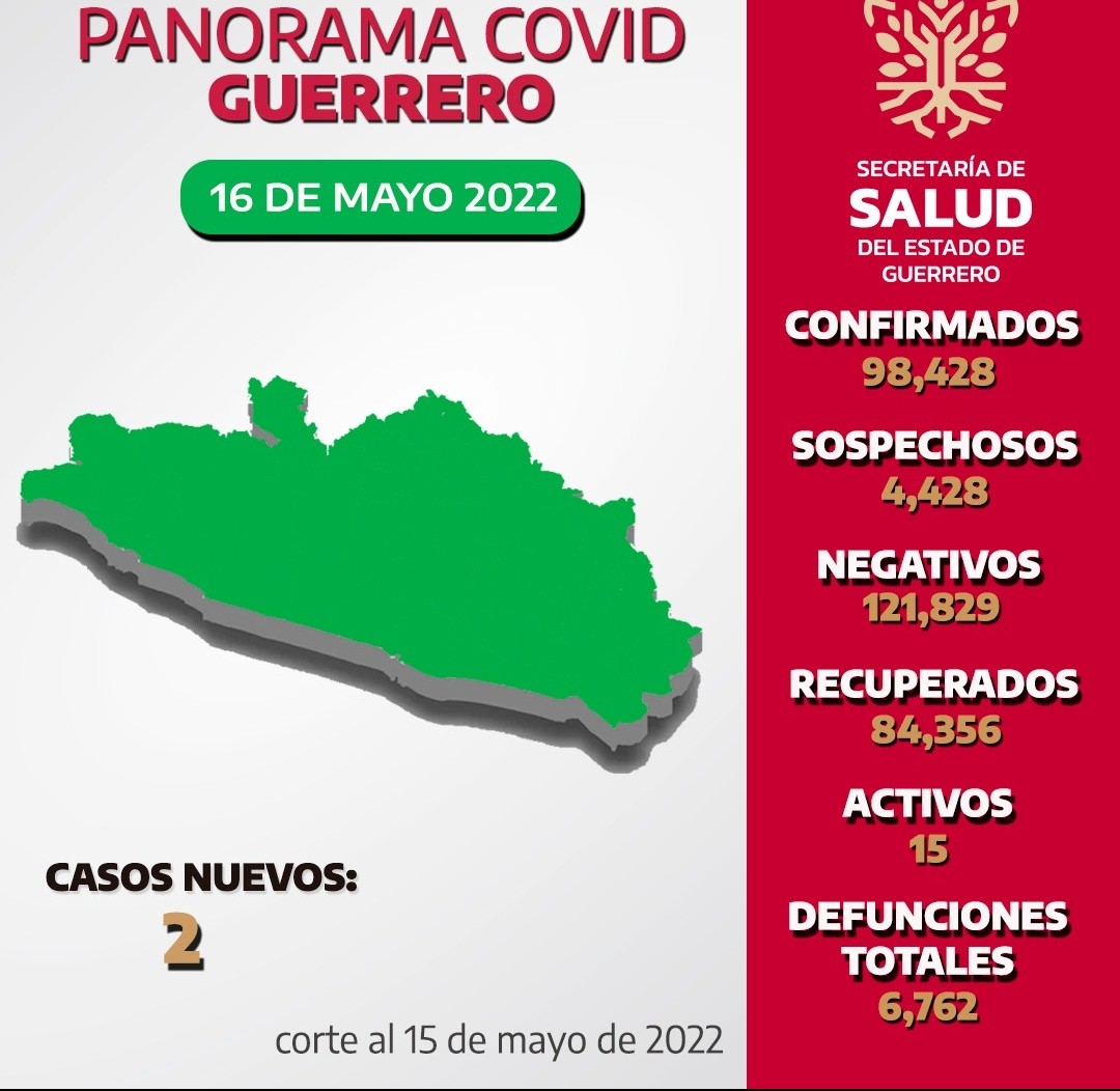 La dependencia estatal informa que de acuerdo al informe técnico “Covid-19 Guerrero”, desde el inicio de la pandemia, en la entidad se acumulan 98,428 casos confirmados y 6,762 defunciones por esta causa, confirmando 15 casos activos que se concentran en los municipios de Acapulco, con 10; Chilpancingo, 3, y Tlapa y Zirándaro, 1 cada uno.