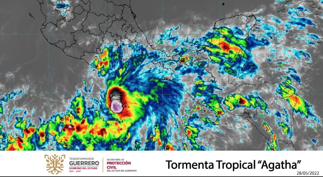 Chilpancingo, Gro., 28 de mayo del 2022.- La Tormenta Tropical “Agatha” continúa fortaleciéndose frente a las costas de Oaxaca, la noche de este sábado presenta vientos máximo sostenidos de 95 kilómetros por hora, rachas de 110 kilómetros por hora y se desplaza hacia el nor-noroeste a 7 kilómetros por hora, se prevé que en las próximas horas siga favoreciendo el potencial de lluvias fuertes en Guerrero.