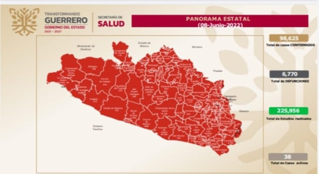 Asimismo, señaló que la ocupación de camas para la atención de pacientes con Covid-19 es del 1 por ciento, y que desde el inicio de la pandemia, en Guerrero se acumulan 98,625 casos confirmados y 6,770 defunciones, y que los 38 casos activos se concentran en los municipios de Acapulco, con 20; Zihuatanejo, 7; Taxco, 5; Chilpancingo e Iguala con 2 cada uno, y Atenango del Río y Olinalá, con 1.