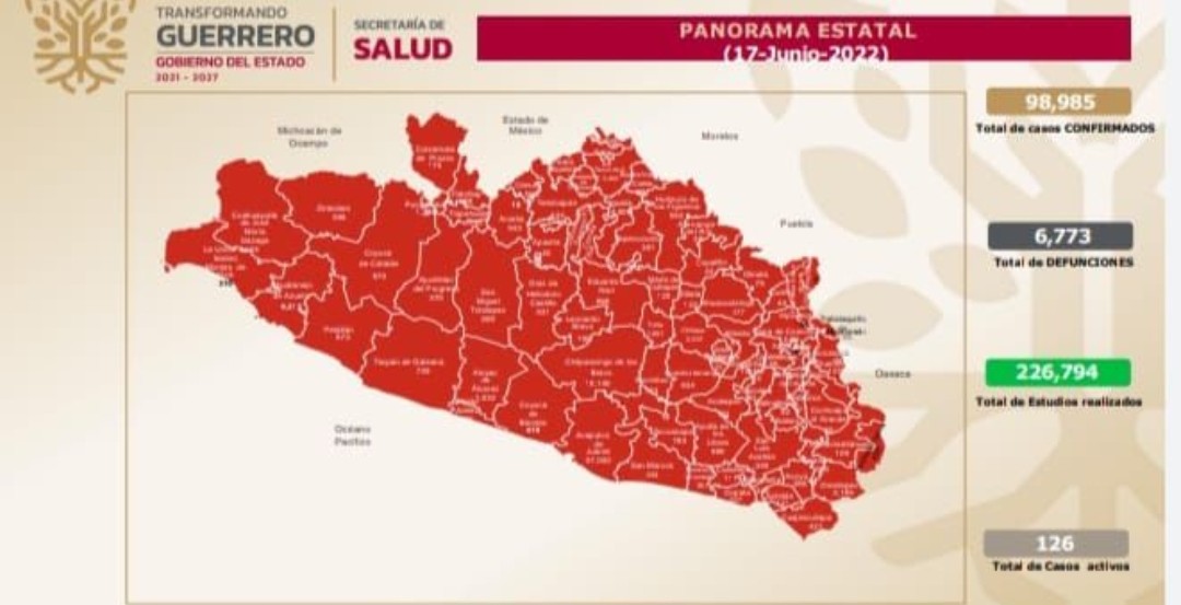 Chilpancingo, Gro., 17 de junio de 2022.- El Estado de Guerrero se ubica en el lugar 30 con 126 casos activos confirmando 29 en las últimas 24 horas, así mismo la Secretaría de Salud estatal informó que en poco más de un mes en toda la entidad no se han presentado defunciones derivadas por el Covid-19, por lo que se hace un llamado a las y los guerrerenses a mantener las medias de prevención pertinentes, esto ante el paulatino incremento de casos activos.