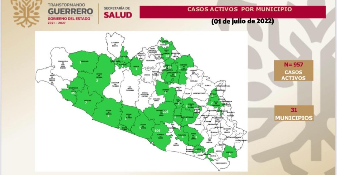 Señaló que al 30 de junio concentra 957 casos en 31 municipios, siendo los principales Acapulco, 609; Chilpancingo, 205; Zihuatanejo, 35; Iguala, 19; Taxco, 14; Tixtla, 9; Benito Juárez, 7; Petatlán, 7; Ometepec, 6; y Coyuca de Benítez, 5.