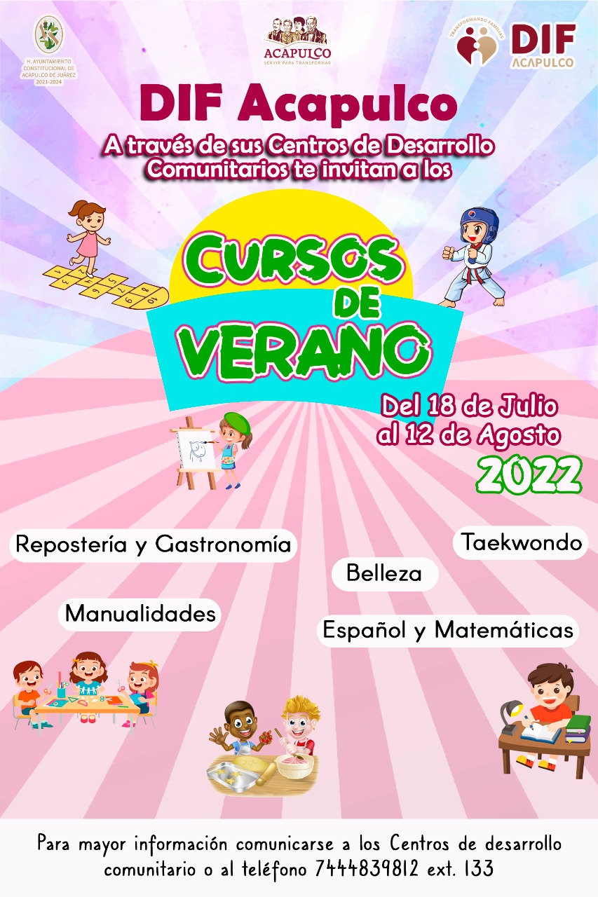 Acapulco, Gro., 01 de julio de 2022.– Con el propósito de promover la sana convivencia en las familias y actividades recreativas para las niñas y niños, el Gobierno Municipal encabezado por la alcaldesa, Abelina López Rodríguez, a través del Sistema Municipal para el Desarrollo Integral de la Familia (DIF), invita a la población acapulqueña a los cursos de verano que se llevarán a cabo del 18 de julio al 12 de agosto en seis de sus Centros de Desarrollo Comunitario.