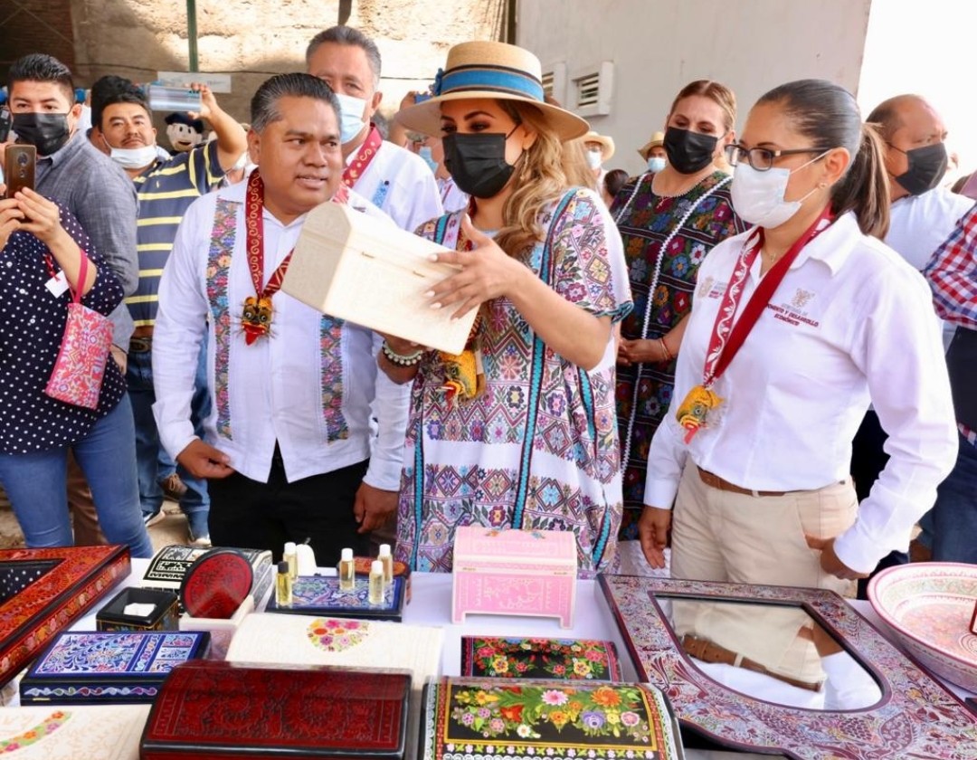 La mandataria estatal, destacó que se dará fortalecimiento a las artesanías que se realizan en Olinalá como las famosas «Cajitas de Olinalá» que tienen denominación de origen, pues son elaboradas con madera de linaloe y laqueadas bajo la técnica prehispánica, con una decoración artística a pulso con colores naturales y estampados únicos.