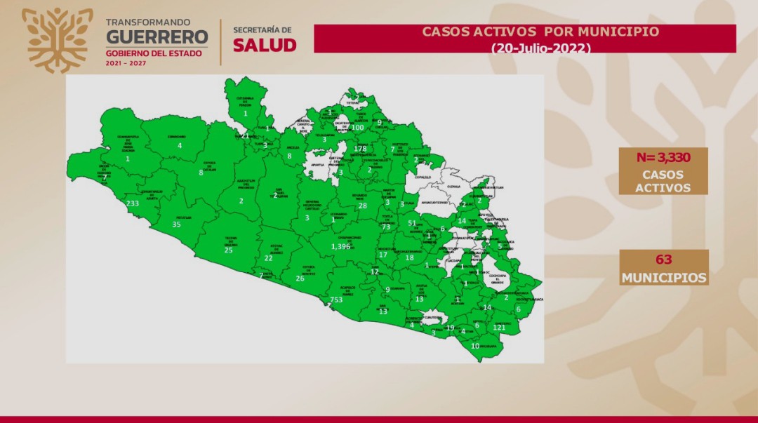 Asimismo, que desde el inicio de la pandemia, Guerrero acumula 107,047 casos confirmados y 6,782 defunciones por esta causa, ubicándose a nivel nacional se ubica en el lugar 21 en casos activos, y que los 3,330 casos se concentran en 63 municipios del estado, siendo los principales Chilpancingo, con 1,396; Acapulco, 753; Zihuatanejo, 233; Iguala, 178; Ometepec, 121; Taxco, 100; Tixtla, 73; Chilapa, 51; Petatlán, 35, y Eduardo Neri, 28.