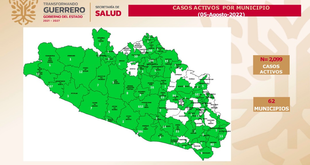 Se dijo que a nivel nacional, Guerrero ocupa el lugar 22 en casos activos, concentrados en 62 municipios, destacando: Chilpancingo, 632; Acapulco, 386; Taxco, 198; Iguala, 194; Zihuatanejo, 107; Tlapa, 101; Chilapa, 84; Ometepec, 80; Tixtla, 23; y Ayutla, 21.