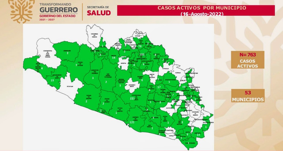 A nivel nacional se mantiene en el sitio 25 en incidencia de casos activos, que se concentran en 53 municipios, principalmente: Chilpancingo, 221; Acapulco, 125; Iguala, 105; Taxco, 78; Tlapa, 48; Zihuatanejo, 19; Chilapa, 17; Arcelia, 14; Ometepec, 14; y Atlixtac, 7.