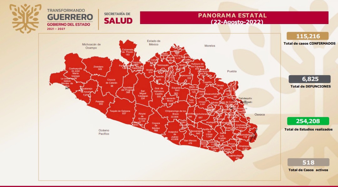 Asimismo, detalló que desde el inicio de la epidemia, Guerrero acumula 115,216 casos confirmados y 6,825 defunciones, concentrándose los casos activos en 43 municipios, siendo los principales Chilpancingo, con 149; Acapulco, 82; Iguala, 68; Taxco, 59; Tlapa, 22; Chilapa, 14; Zihuatanejo, 14; Arcelia, 12; Atlixtac, 11, y Huitzuco, 8.