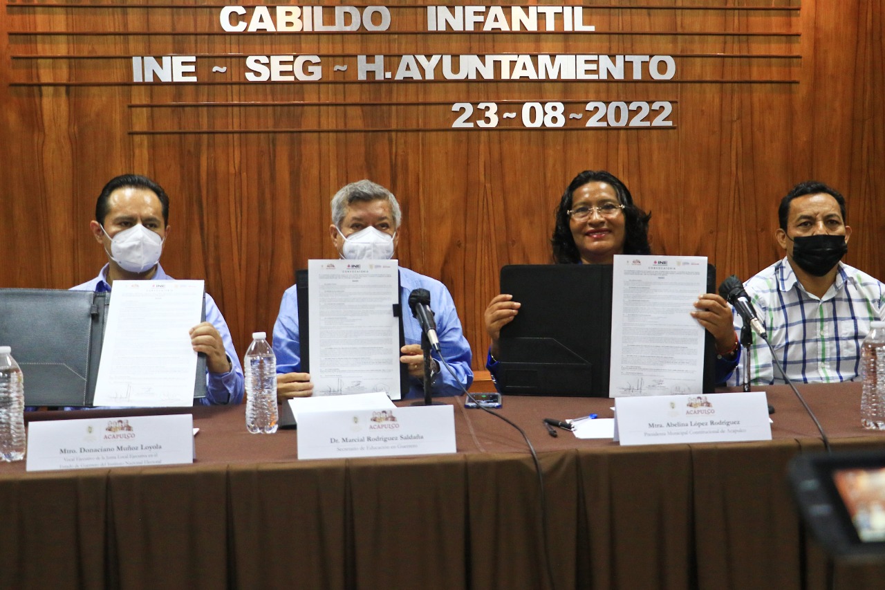 Acapulco, Gro., 23 de agosto de 2022.– Con la finalidad de establecer las bases y mecanismos que permitan acciones de profesionalización, capacitación y desarrollo de competencias en materia electoral, la presidenta municipal, Abelina López Rodríguez, signó un convenio de colaboración con el Instituto Nacional Electoral (INE), y firmó la convocatoria para los aspirantes al Cabildo Infantil con la Secretaría de Educación Guerrero (SEG).