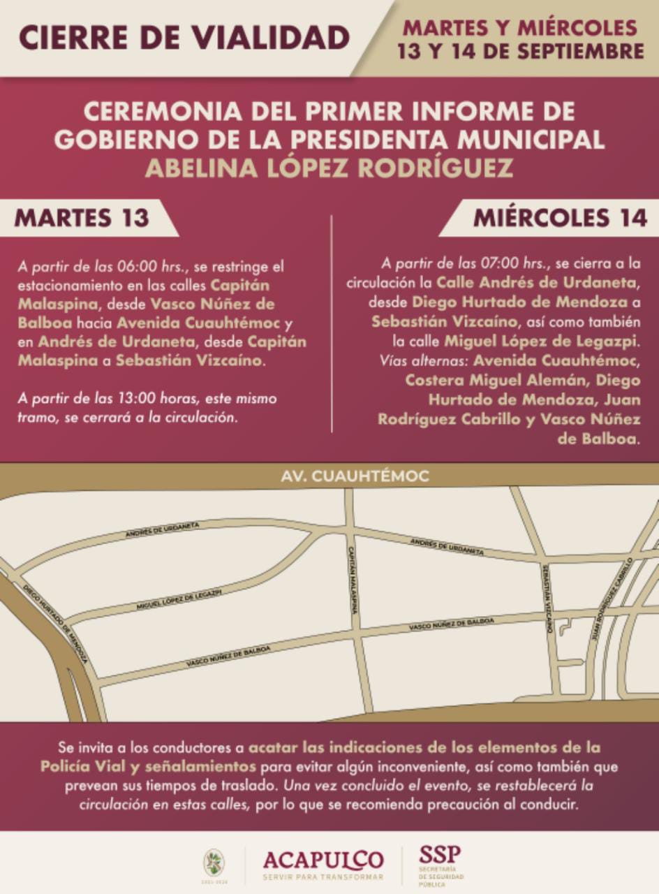 Acapulco, Gro., 12 de septiembre de 2022.– La Secretaría de Seguridad Pública Municipal, informó a la población en general, las restricciones de estacionamiento y circulación que, con motivo del Primer Informe de Gobierno de la alcaldesa, Abelina López Rodríguez, que rendirá el miércoles 14 de septiembre. Se pide a las y los ciudadanos tomar sus medidas y rutas alternas.