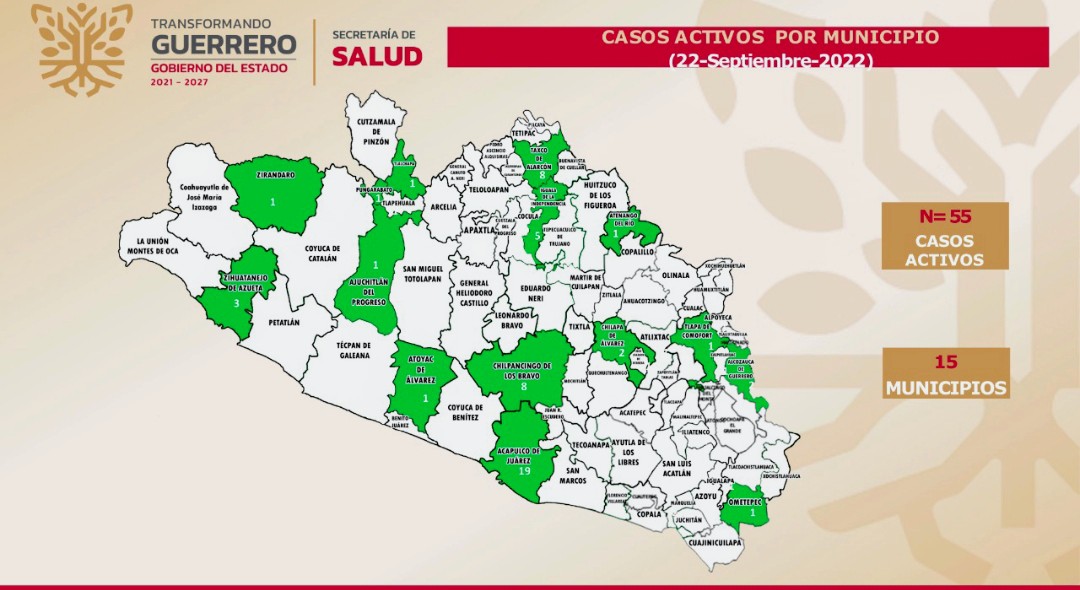 La dependencia estatal detalló que la entidad ocupa el lugar 29 a nivel nacional en casos activos distribuidos en 15 municipios, entre ellos Acapulco, con 19; Chilpancingo, 8; Taxco, 8; Iguala, 5; Zihuatanejo, 3; Alcozauca, 2; Chilapa, 2; Ajuchitlán, 1; Atenango del Río, 1; y Atoyac, 1.