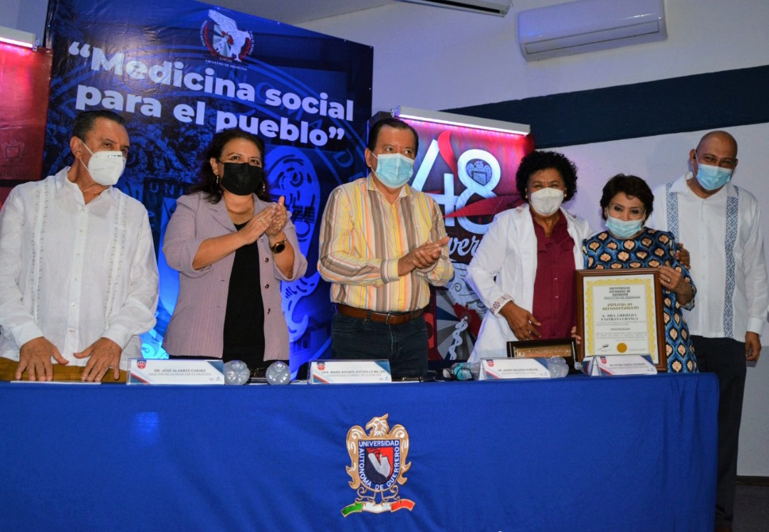 Acapulco, Gro, 23 de septiembre del 2022. La secretaria de Salud en Guerrero, Aidé Ibarez Castro, participó en la clausura de las actividades académicas y culturales con motivo de 48 aniversario de la Facultad de Medicina de la Universidad Autónoma de Guerrero (UAGro) en Acapulco.