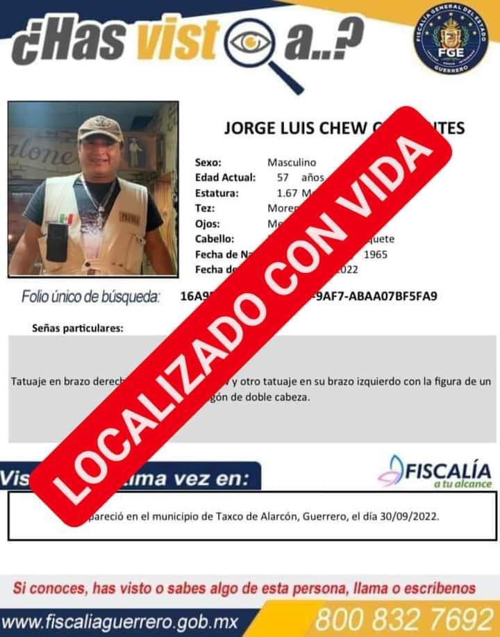 El periodista taxqueño Jorge Luis Chew Cervantes fue localizado está madrugada tras ser reportado como desaparecido.