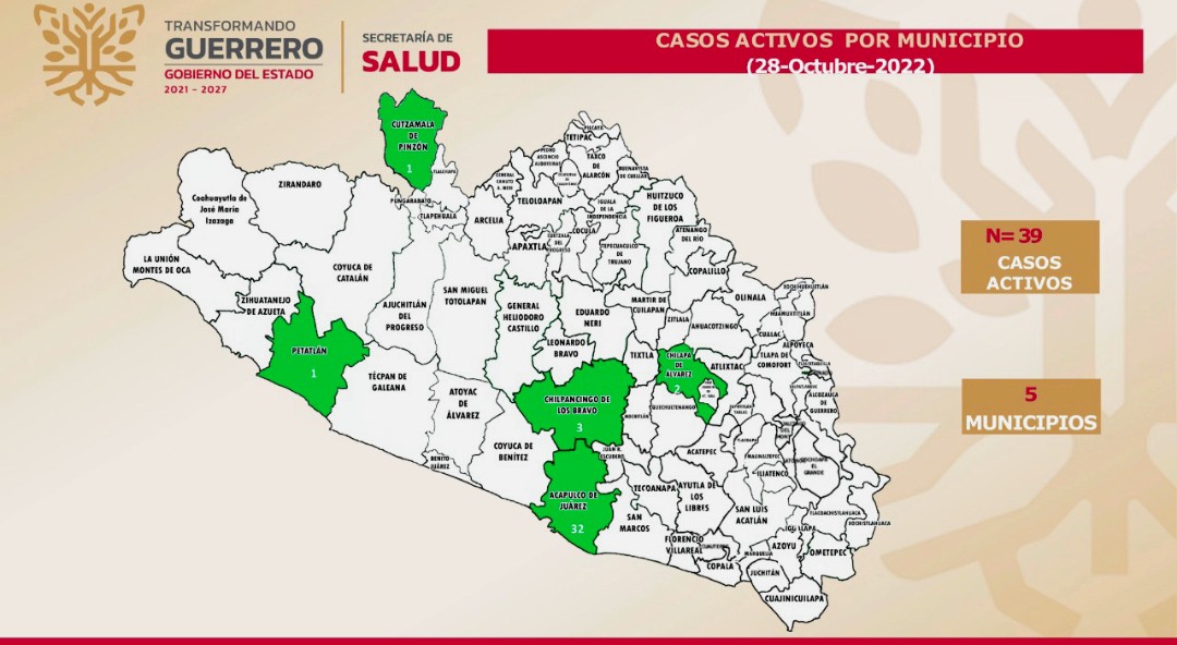 Chilpancingo, Gro., 28 de octubre 2022.- Al reiterar el llamado a los guerrerenses a mantener las medidas preventivas contra el Covid-19, la Secretaría de Salud informó que al 27 de octubre se reportan 39 casos activos, de los cuales 7 se registraron en las últimas 24 horas, sin nuevas defunciones ni personas hospitalizadas por esta causa.