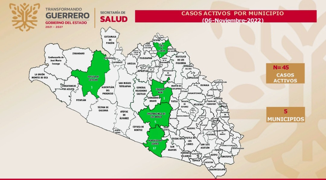 Al presentar el informe técnico diario sobre el estado de la pandemia en Guerrero, indicó que la entidad acumula 116,047 casos confirmados y 6,847 defunciones, y ocupa el lugar 22 nacional en casos activos, distribuidos en cinco municipios: Acapulco, 37; Chilpancingo, 5; Coyuca de Catalán, 1; Eduardo Neri, 1; y Taxco de Alarcón, 1.