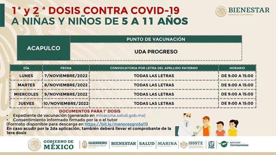 De acuerdo a la convocatoria, del 7 al 10 de noviembre se inmunizará a los menores en todas las letras del abecedario en la Unidad Deportiva Acapulco, ubicada en la colonia Progreso; los ciudadanos serán atendidos de 9 a 15 horas.