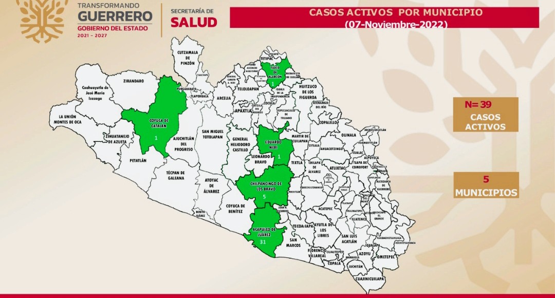 Chilpancingo, Gro., 07 de Noviembre 2022.- La Secretaría de Salud Guerrero (SSG) informó que al 06 de noviembre, se reportan 39 casos activos de Covid-19, sin registro de defunciones en las últimas 24 horas, manteniendo una ocupación hospitalaria del 1 por ciento.