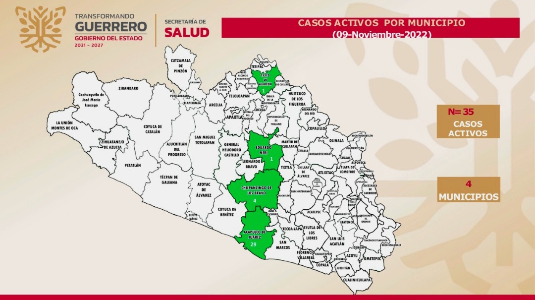 Al dar a conocer el informe técnico sobre el estado de la pandemia, indicó que la entidad acumula 116,062 casos confirmados y 6,847 defunciones, y ocupa el lugar 26 nacional en casos activos, distribuidos en los municipios de Acapulco, con 29; Chilpancingo, 4, y Eduardo Neri y Taxco con 1 cada uno.