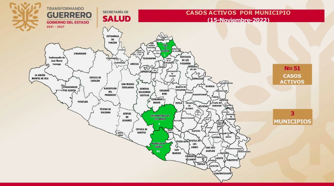Chilpancingo, Gro., 15 de noviembre 2022.- La Secretaría de Salud Guerrero (SSG) informó que al 14 de noviembre se reportan 51 casos activos de Covid-19, lo que representa una baja en la transmisión de este virus, por lo que se llama a la población a seguir con las medidas sanitarias correspondientes para evitar la propagación de esta enfermedad.