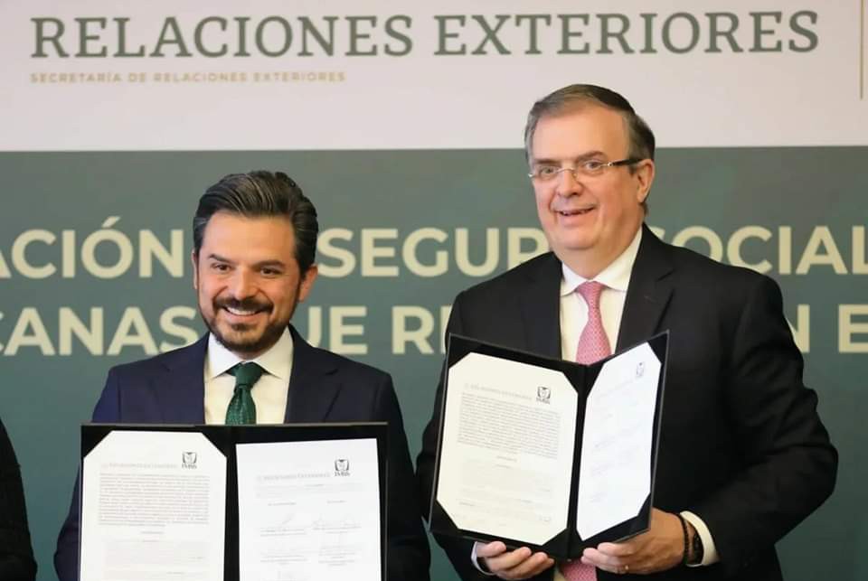 Esta mañana, el canciller Marcelo Ebrard Casaubon y el director general del Instituto Mexicano del Seguro Social (IMSS), Zoé Robledo, suscribieron un convenio de colaboración específico que permitirá a las personas trabajadoras que residen en el exterior afiliarse como derechohabientes al IMSS en las ventanillas de documentación de cualquiera de los consulados y embajadas de México en el mundo.