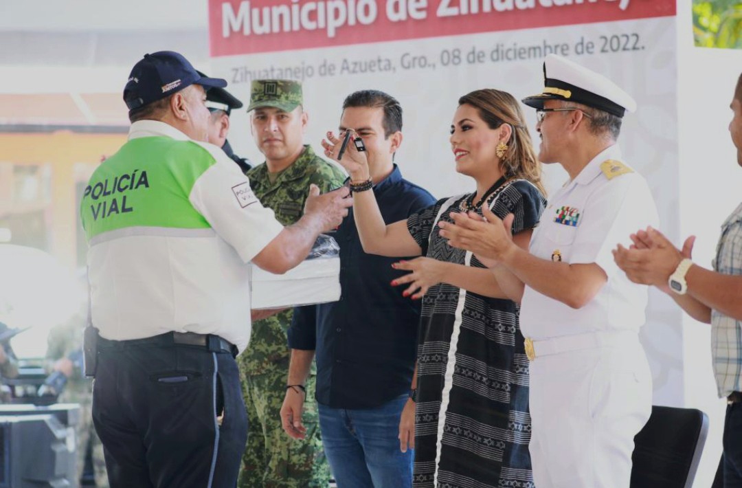 Zihuatanejo de Azueta, Gro., 08 de diciembre de 2022.- Con el propósito de fortalecer el trabajo coordinado para mejorar la seguridad, promover la prevención del delito e impulsar acciones de pacificación en este municipio de la Costa Grande, la gobernadora Evelyn Salgado Pineda y el alcalde de Zihuatanejo, Jorge Sánchez Allec, entregaron patrullas, equipo y uniformes a personal de Seguridad Pública Municipal, a través de un esquema de coinversión entre los dos órdenes de gobierno, destinando más de 14 millones de pesos para atender este rubro prioritario en beneficio de habitantes y visitantes.