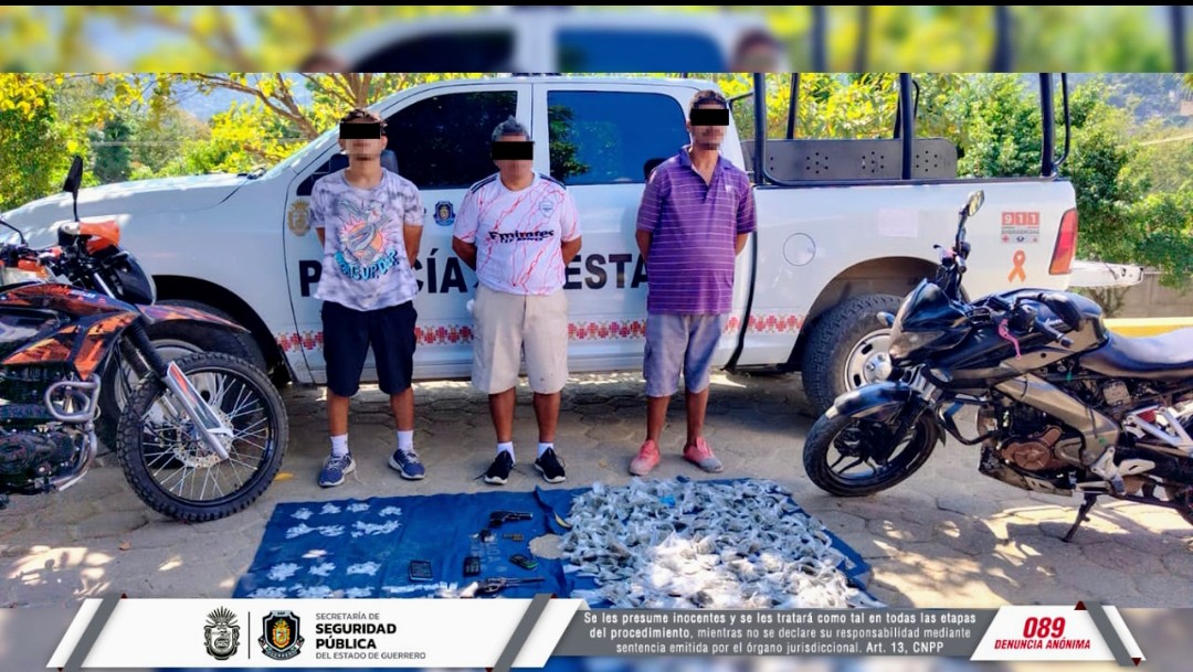 Chilpancingo, Guerrero, 09 de diciembre de 2022.- En acciones de seguridad y prevención del delito, personal de la Policía Estatal detuvo a tres personas en posesión de presunta droga y dos armas de fuego en el municipio de Acapulco.