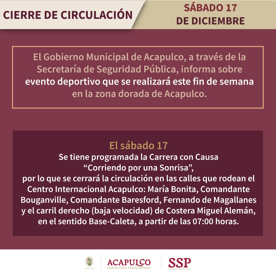 Acapulco, Gro., 16 diciembre del 2022.- Con la finalidad de apoyar el deporte y las buenas causas, el gobierno municipal que encabeza la presidenta Abelina López Rodríguez, a través de la Secretaría de Seguridad Pública, informa a la ciudadanía que este sábado 17, se llevará a cabo una carrera en las inmediaciones del Centro Internacional Acapulco –CIA-, en el fraccionamiento Costa Azul.