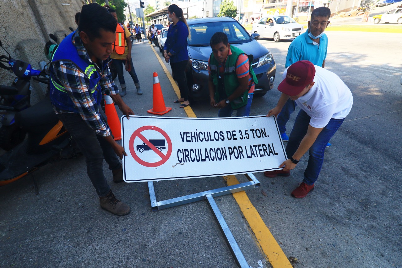 Acapulco, Gro., 12 de enero de 2023.– Con la finalidad de salvaguardar la integridad de la población y evitar accidentes automovilísticos, el Gobierno Municipal, a través de la Coordinación de Movilidad y Transportes, instaló señalamientos para restringir la circulación de unidades pesadas, superior a las 3.5 toneladas, en los diversos puentes de la ciudad.