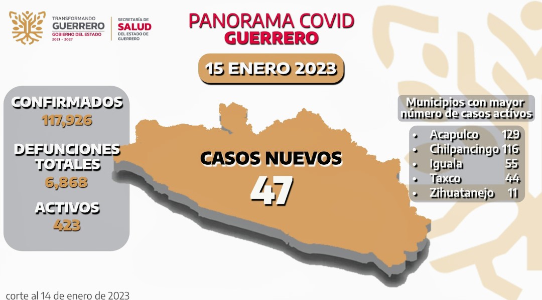 La Secretaría de Salud Guerrero (SSG) informó que al 14 de enero se registran 423 casos activos de Covid-19, de los cuales 47 se confirmaron en las últimas 24 horas.