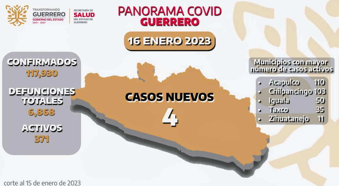 Chilpancingo, Gro., 16 de enero 2023.- Aunado a las enfermedades respiratorias que se propagan por los cambios bruscos de clima que se presentan en todas las regiones del estado, la Secretaría de Salud Guerrero (SSG) informó que al 15 de enero se registran 371 casos activos de COVID-19, de los cuales 4 se confirmaron en las últimas 24 horas.
