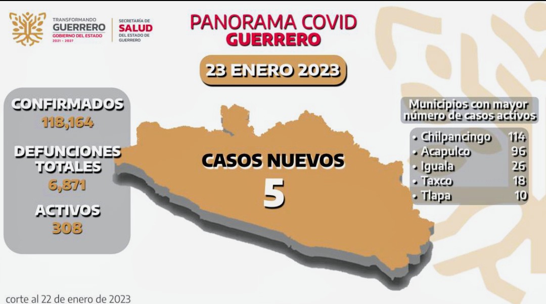 Al presentar el informe técnico diario sobre el estado de la pandemia en Guerrero, la dependencia indicó que la entidad acumula 118,164 casos confirmados y 6,871 defunciones, y reiteró el llamado a mantener las medidas preventivas para evitar el aumento de contagios del virus SARS-CoV-2.