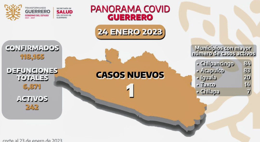 La Secretaría de Salud Guerrero (SSG) informó que al 23 de enero se registran 242 casos activos de Covid-19, de los cuales uno se confirmó en las últimas 24 horas, por lo que reiteró el llamado a la población a mantener las medidas preventivas.