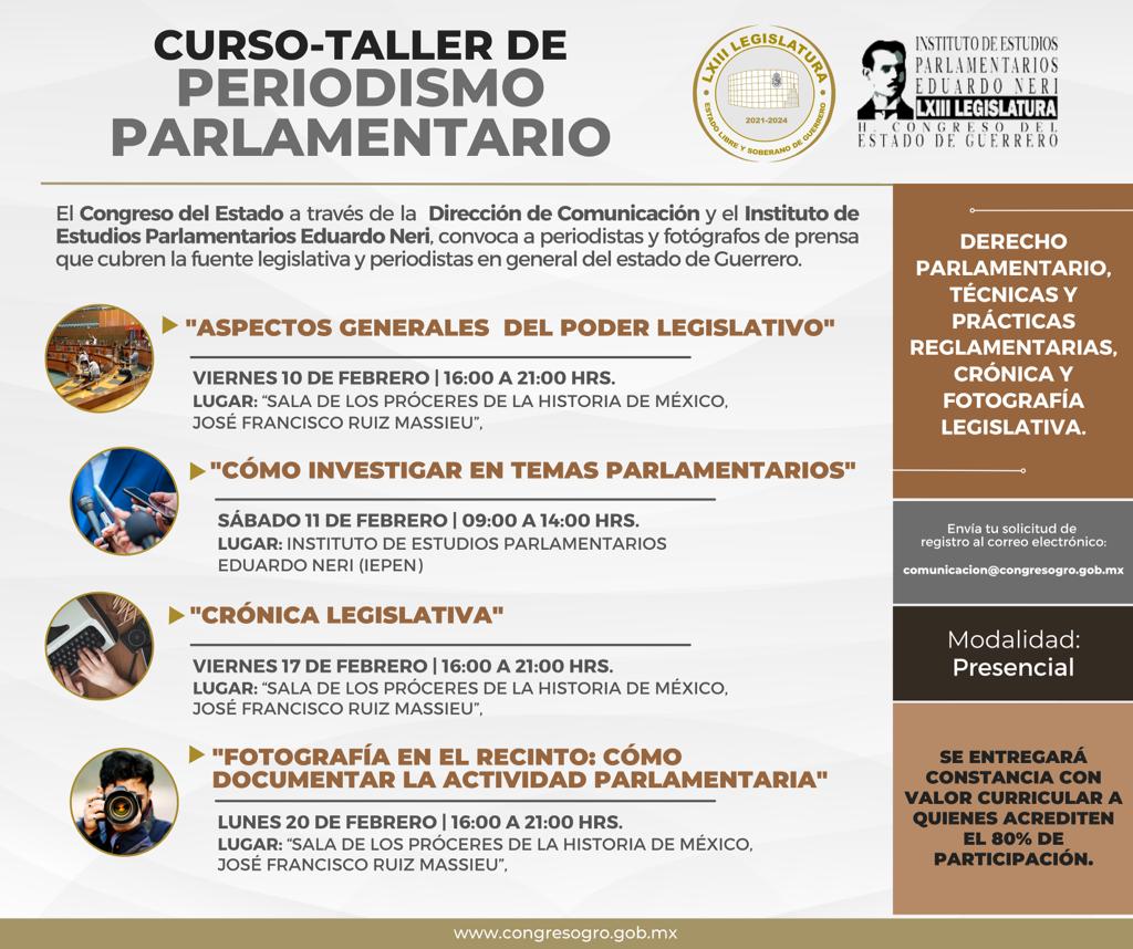 Chilpancingo, Gro., 07 de febrero de 2023.- El Congreso del Estado, a través de la Dirección de Comunicación y del Instituto de Estudios Parlamentarios Eduardo Neri, desarrollará un curso-taller de Periodismo Parlamentario para periodistas y fotógrafos que cubren la fuente legislativa y trabajadores de los medios de comunicación en general.