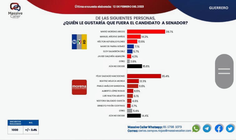 Chilpancingo, Gro., lunes 13 de febrero del 2023.- La encuestadora Massive Caller publicó ayer una encuesta donde Morena encabeza las preferencias electorales para la elección a Senador de la República en Guerrero para el 2024.