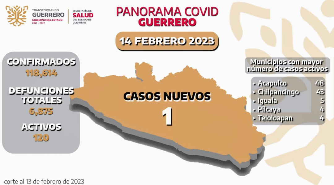 La Secretaría de Salud Guerrero informó que al corte del 13 de febrero, se reportan 120 casos activos de COVID-19, de los cuales 1 se confirmó en las últimas 24 horas, por lo que llama a la población a mantener las medidas para evitar el aumento de contagios.