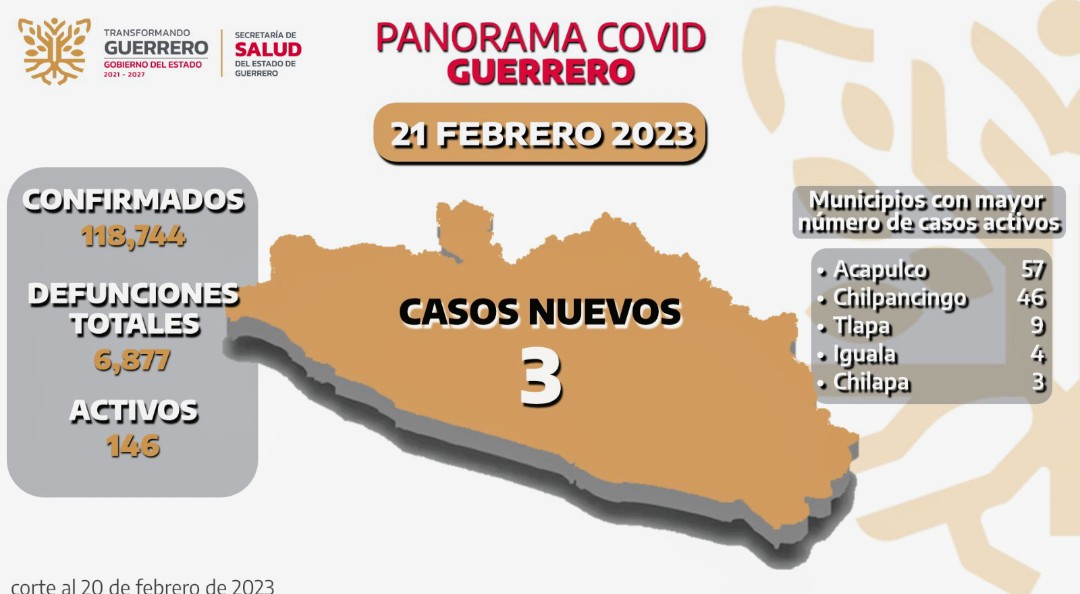 En el informe técnico diario sobre el estado de la pandemia en Guerrero, la SSG informó que al corte del 20 de febrero se acumulan 118,744 casos confirmados y 6,877 defunciones, e insistió en el llamado a mantener las medidas preventivas para evitar el aumento de contagios del virus SAR-COV-2.