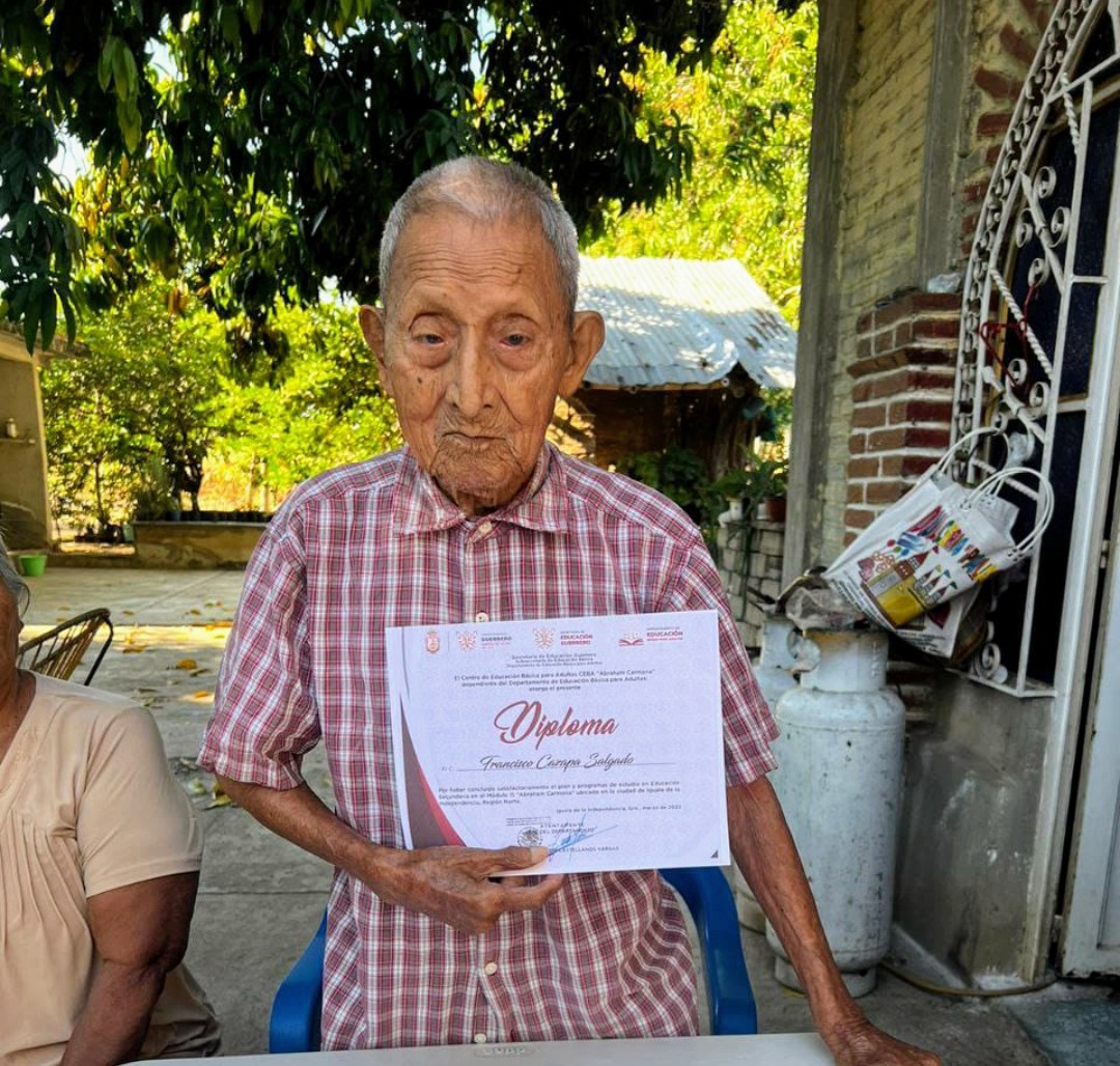El viernes 3 de marzo don Francisco recibió un reconocimiento por parte del jefe del Departamento de Educación Básica para Adultos, José Martín Castellanos Vargas, por haber concluido satisfactoriamente su educación secundaria.