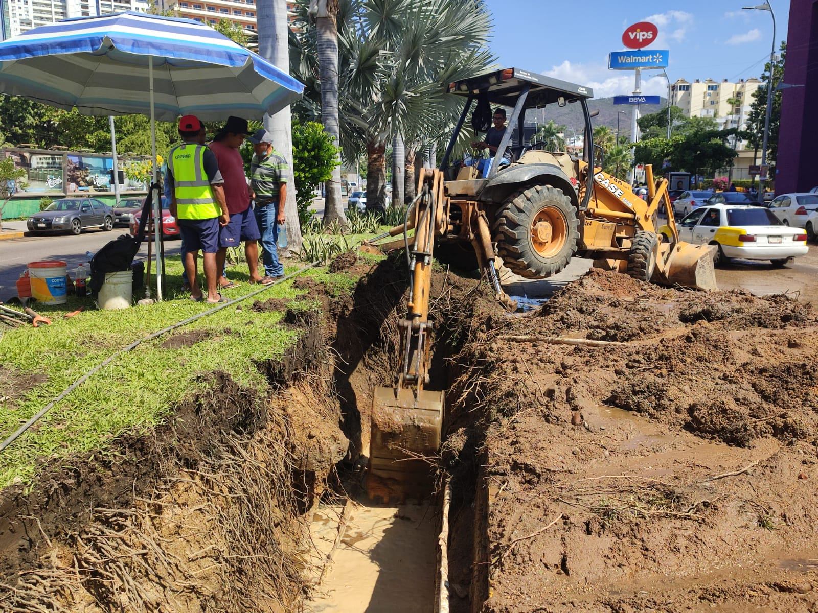 Personal del área operativa, con apoyo de una retroexcavadora, interviene la fuga del vital líquido en una línea de conducción de 6 pulgadas de asbesto, en la principal arteria de la zona turística, frente a conocido casino.