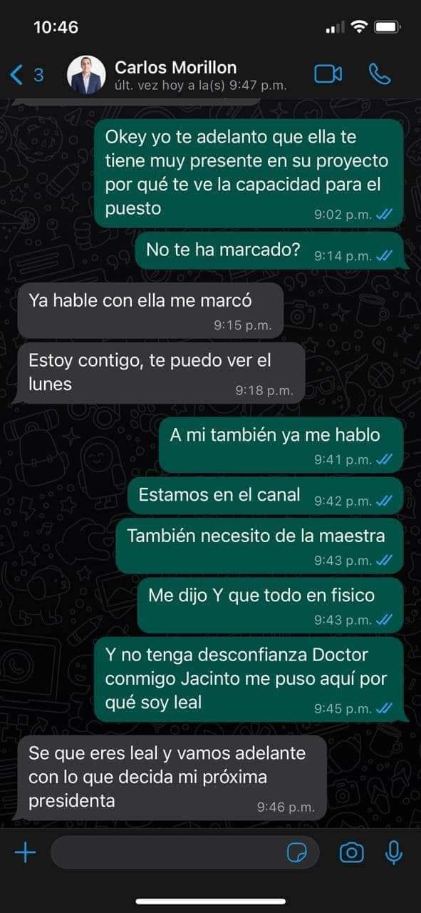 Además, le dice que es bien aceptado en el proyecto «Y», al parecer en referencia a la diputada Yoloczin Domínguez, y que «no tenga desconfianza». «Jacinto me puso aquí porque soy leal», le expresa la persona.